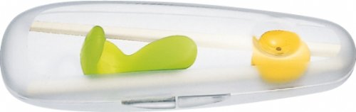 コンビ株式会社が展開するベビー用品ブランド、ベビーレーベルのトレーニング用箸。箸トレーニングにおけるポイントである正しい位置で箸を持つこと、適切な間隔で2本の箸を持つこと、正しい指の位置を身につけることを重視し、作業療法士の意見を取り入れて開発された商品。 2本の箸を適切な間隔で持って開閉トレーニングをすることができる開閉トレーニングブリッジ、小さい子どもの手の中に適切な空間を作り、指先に力を集中しやすい形状につくられたはじめておはしサポーターが付属。2つの部品をはずせば普通の箸として使用できるので、トレーニング後も長く使うことができる。右利き、左利き両用。外出時の携帯に便利なケースと、箸トレーニングのポイントをわかりやすく説明した「おはしのおはなし」が付属している。