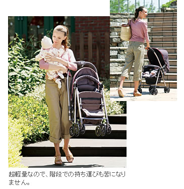 わずか3.9kgの軽さで、毎日気軽に使えるベビーカー。いつもの階段が苦にならず、積極的&アクティブにおでかけできる。軽くて座面部もゆったりとしているので、そのままB型ベビーカーとしても使える。