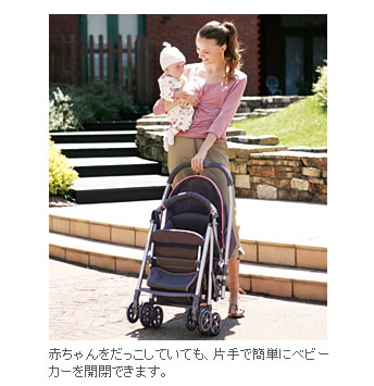 赤ちゃんをだっこしていても、荷物の多い外出先でも、片手で簡単にベビーカーを開閉できる。電車や階段でも焦らずワンタッチ開閉。赤ちゃんとのおでかけの幅が広がる。