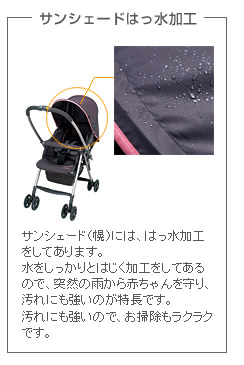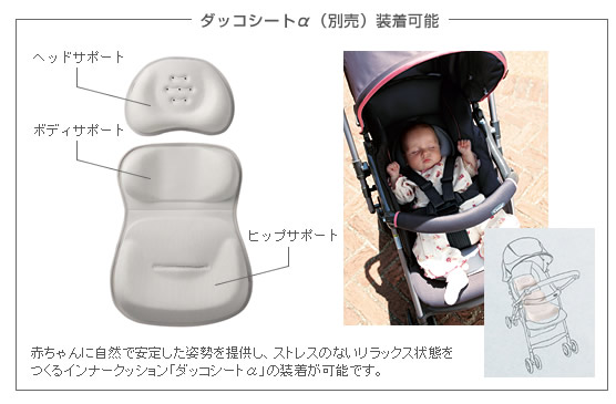 別売りのインナークッション「ダッコシートα」の装着が可能、水をしっかりはじくサンシェードはっ水加工など、赤ちゃんにやさしい機能を備えている。
