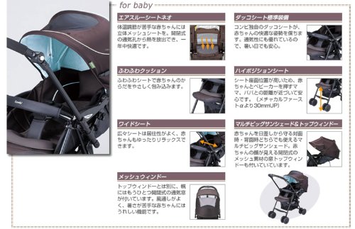 吸湿・速乾性に優れたエアスルーシートネオ、ベビーカーを押すママ、パパとの距離が近づいて安心のハイポジションシート、ふわふわクッションなど、赤ちゃんへの思いやり機能がたくさん詰まっている