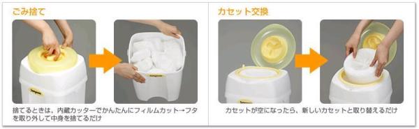 特長3:ごみ捨ても取り替えも簡単 本体がいっぱいになったら、フタを外して中身を捨てるだけ。カセットが空になったら新しいカセットと取り替えるだけ。ごみ捨ても取り替えも簡単。