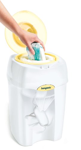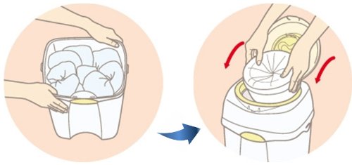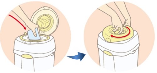 レバーを回すだけで抗菌衛生フィルムがネジれて、紙おむつを密封します。