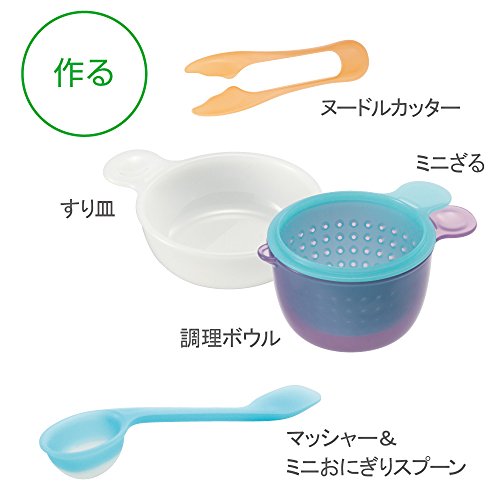 - [セット内容・付属品] [離乳食調理器]すり皿・ミニざる・調理ボウル・ヌードルカッター・マッシャー&ミニおにぎりスプーン/[食器]ランチプレートセット・ご飯茶碗・深皿・ミルクカップ・フィーディングスプーン・スプーン・フォーク・レンジ用フタ/愛情満点レシピ付き
