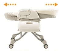 移動しやすい4輪キャスター、5段階の高さ調節とリクライニングなど、室内のどんな場面でもいつもママのそばで快適に過ごせる。