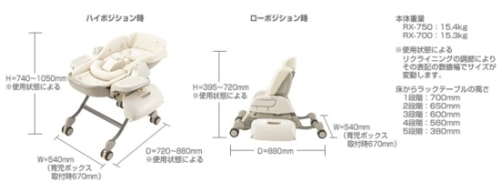 ハイポジション時 H740~1050mm(使用状態による)、W540mm(育児ボックス取付時670mm)、D720~880mm(使用状態による)
