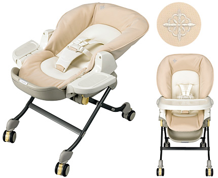 ロワイヤルオートスウィングはそっと一押しすると約15分間揺れる電動スウィング、オルゴールのような音質で奏でられるヒーリングサウンドなどの機能が、ロワイヤルプラスはやさしい手動スウィングが赤ちゃんを心地よい眠りに誘う。
