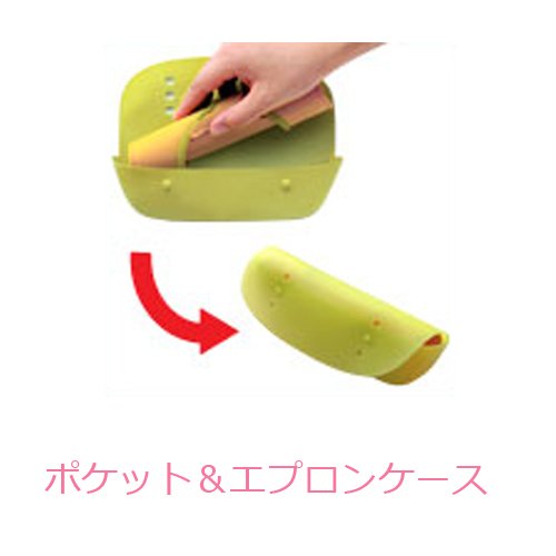 - ポケット部がケースになり、はずして折りたたんだエプロン部、スプーン、フォーク等をコンパクトに収納できます。