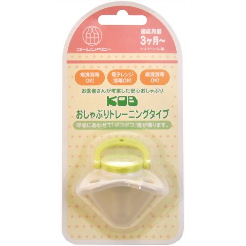 ●【商品説明】●「KOB おしゃぶりトレーニングタイプ グリーン」は、呼吸に合わせて音が鳴るシリコーンゴム製のおしゃぶりです。●ポコポコと音が鳴ることで使用を確認でき、吸い口の中に水が入りません。●また、プレート部に、ムレにくく吸い跡がつきにくくする溝が設けてあり、万一吸い口を噛み切った場合でも溝があるので通気を助けます。●適応月齢:3か月から。●【使用方法】●赤ちゃんがおしゃぶりを吸うと、防水弁が「ポコポコ」と音を発し、赤ちゃんの使用音を確認できます。●【使用上の注意】●ご使用の際は煮沸・洗浄等の消毒をしてください。●歯で噛むとキズや切れの原因となる場合がありますので早めにお取替えください。●長期的にご使用になりますと乳首の耐久性が落ちますので新しいものと交換してください。●【製品仕様】●乳首:シリコーンゴム 160度座板等:ポリプロピレン 110度●【原産国】●日本●【お問い合わせ先】●お客様相談室 03-5825-1152受付時間 9:00-17:00(土日祝祭日を除く)●内容量:1個●カラー:グリーン●重量(kg):0●まとめ買いの場合、...