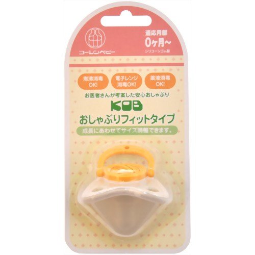 ●【商品説明】●「KOB おしゃぶりフィットタイプ イエロー」は、成長にあわせてサイズ調整できるシリコーンゴム製のおしゃぶりです。●成長に合わせて吸い口の厚みを調節でき、吸い口の中に水が入りません。●また、プレート部に、ムレにくく吸い跡がつきにくくする溝が設けてあり、万一吸い口を噛み切った場合でも溝があるので通気を助けます。●適応月齢:0か月から。●【使用方法】●ツマミをOPENに合わせ、吸い口を適度な厚みに調整し、CLOSEで閉じてください。●*厚みの目安0か月-:約3mm4か月-:約6mm8か月-:約10mm※月齢によるサイズ設定はあくまでも目安ですので、お子様の成長に合わせて調節してください。●【使用上の注意】●ご使用の際は煮沸・洗浄等の消毒をしてください。●歯で噛むとキズや切れの原因となる場合がありますので早めにお取替えください。●長期的にご使用になりますと乳首の耐久性が落ちますので新しいものと交換してください。●【ご注意】●水が入る恐れがあるため、洗浄・消毒の際は調節弁を閉めた状態で行って下さい。●【製品仕様】●乳首:シリコーンゴム 160度座板...