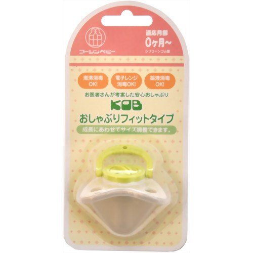 ●【商品説明】●「KOB おしゃぶりフィットタイプ グリーン」は、成長にあわせてサイズ調整できるシリコーンゴム製のおしゃぶりです。●成長に合わせて吸い口の厚みを調節でき、吸い口の中に水が入りません。●また、プレート部に、ムレにくく吸い跡がつきにくくする溝が設けてあり、万一吸い口を噛み切った場合でも溝があるので通気を助けます。●適応月齢:0か月から。●【使用方法】●ツマミをOPENに合わせ、吸い口を適度な厚みに調整し、CLOSEで閉じてください。●*厚みの目安0か月-:約3mm4か月-:約6mm8か月-:約10mm※月齢によるサイズ設定はあくまでも目安ですので、お子様の成長に合わせて調節してください。●【使用上の注意】●ご使用の際は煮沸・洗浄等の消毒をしてください。●歯で噛むとキズや切れの原因となる場合がありますので早めにお取替えください。●長期的にご使用になりますと乳首の耐久性が落ちますので新しいものと交換してください。●【ご注意】●水が入る恐れがあるため、洗浄・消毒の際は調節弁を閉めた状態で行って下さい。●【製品仕様】●乳首:シリコーンゴム 160度座板...
