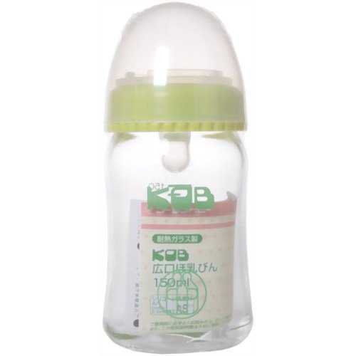 ●【商品説明】●「KOB 広口ほ乳びん 150ml グリーン」は、耐熱ガラスを使用したほ乳びんです。●煮沸消毒ができるので衛生的です。●また、ガラスは加熱しても環境ホルモンの心配がなく、ガラスを作る触媒には、安全な食塩を使用しています。●【使用方法】●(1)乳首をキャップに下方向から通します。●※くぼみの部分がキャップぐちにはまります。●(2)びんにセットします。●※キャップをゆるめにしめるとミルクの流量が多くなり、きつくしめると少なくなります。●※お取り替えの目安●ひとつの乳首に赤ちゃんがなじむと新しい乳首に替えた際イヤがることがあります。●乳首は2個以上を交互に約2か月をメドに使い、破れたり切れたりしないように古くなったら使用回数にかかわらず早めに交換しましょう。●乳首は歯の生えた赤ちゃんが、強く噛むと裂ける可能性がありますのでご注意ください。●【使用上の注意】●強く吸った場合等、乳首とキャップの間にすき間が出来ることがあります。●お子様が唇や舌をはさむ恐れがありますのでご注意ください。●ほ乳びんは赤ちゃんの授乳や他の飲み物を与えるためのものです。...