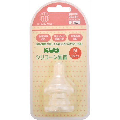「KOB シリコーン乳首 Mサイズ クロスカット 2コ入」は、吸っても吸ってもつぶれないほ乳びん用乳首です。独自の空気溝により、ボトル中の真空状態を防ぎミルクの流量を一定に保ちます。シリコーンゴム製で、煮沸消毒・電子レンジ消毒・薬液消毒に対応しています。