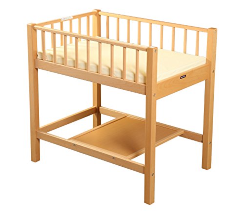 おむつ替えしやすいように手前側は常にオープン。ミニベッドと同じサイズ(内寸約60㎝×90㎝)だから、広く使えます。とこ板には、通気性の良い国産ひのきのスノコを使用(岡山、広島県産)。マットには、お手入れのしやすいビニールレザーマットを使用(厚さ約5cm)。寝台の高さは床からマット上までで約75㎝と、お世話の楽な高さです。
