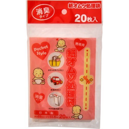 「紙オムツ処理袋 消臭タイプ 携帯用 20枚入」は、消臭機能付きでイヤなにおいを消臭する紙おむつ処理袋です。
