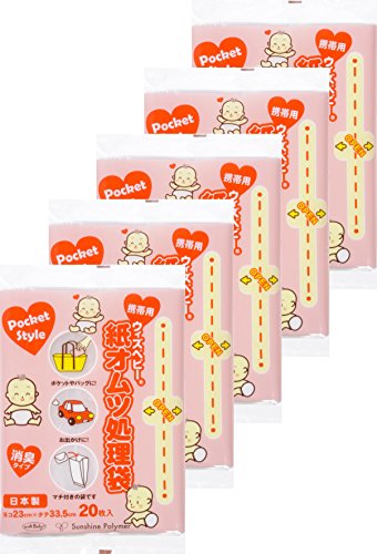 携帯に便利、コンパクトに包装したポリエチレン製の赤ちゃんの使用済み紙おむつの処理袋です。消臭剤を配合、使用済み紙おむつのイヤなニオイを消臭します。紙おむつがすっぽりと入るゆったりサイズの袋です。材料及び加工はすべて国内生産です。20枚×5個組です。