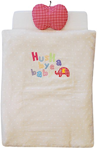 - [本体サイズ] 掛カバー/約70×85㎝、ヌード掛布団/約70×85㎝、フィットシーツ/約60×90㎝、固綿マット/約60×90×5cm、枕カバー/約21×29㎝、ヌード枕/約21×29㎝、キルトパッド/約60×90㎝、防水シーツ/約60×90㎝