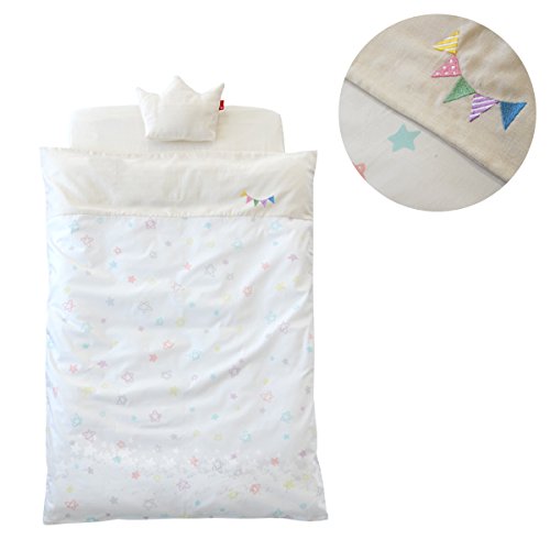 - ■セット内容とサイズ 1.掛けカバー 約90×120cm 2.ヌード掛布団 約85×115cm 3.フィットシーツ 約70×120cm 4.洗える固綿マット 約70×120×2.5cm×2 5.王冠まくら 約25×25cm 6.キルトパッド 約70×120cm 7.防水シーツ 約70×120cm