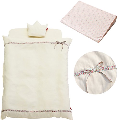 - ■セット内容とサイズ 1.掛けカバー 約90×120cm 2.ヌード掛布団 約85×115cm 3.フィットシーツ 約70×120cm 4.洗える固綿マット 約70×120×2.5cm×2 5.王冠まくら(チューブチップ) 約26×20cm 6.キルトパッド 約70×120cm 7.防水シーツ 約70×120cm 8.スリーピングピロー 約35×50×7cm
