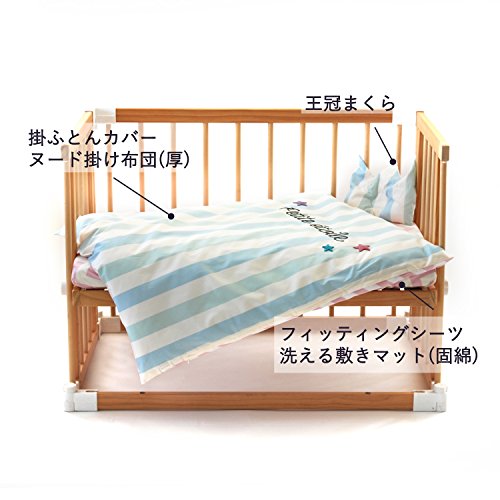 掛けカバー 綿100% ヌード掛布団(厚) 側地・詰め物:ポリエステル100% フィッティングシーツ 綿100% 固綿マット 側地・詰め物:ポリエステル100% 王冠まくら 側地:綿100%、詰め物:ポリエチレン(チューブチップ) 洗濯可(ネット使用) 日本製