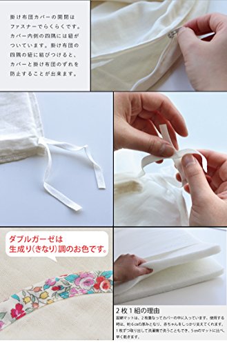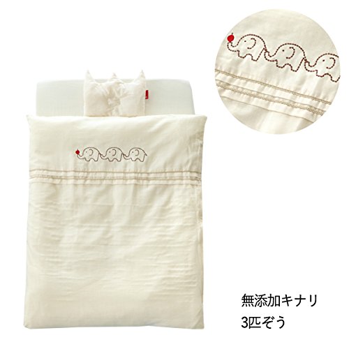 - ■素材 1.掛けカバー 綿100%(無地生成り部分には無添加のダブルガーゼを使用) 2.ヌード掛布団(厚) 側地:ポリエステル100%、詰め物:ポリエステル100% 3.フィッティングシーツ 綿100%(無添加ダブルガーゼ) 4.洗える固綿マット 側生地:ポリエステル100% 詰め物:ポリエステル100% 5.王冠まくら 側地:綿100%、詰め物:ポリエステル100% 6.キルトパッド 生地:ポリエステル65%、綿35%、詰め物:ポリエステル100% 7.防水シーツ ポリエステル100%