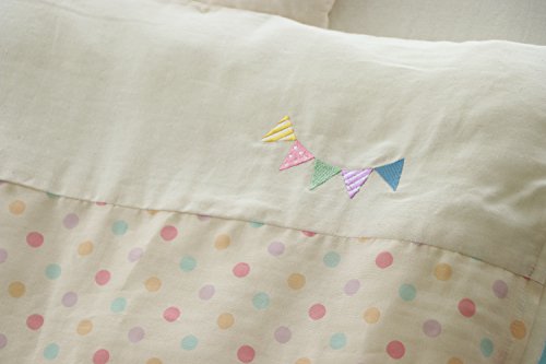 - ■素材 1.掛けカバー 綿100%(無地生成り部分には無添加のダブルガーゼを使用) 2.ヌード掛布団(厚) 側地:ポリエステル100%、詰め物:ポリエステル100% 3.フィッティングシーツ 綿100%(無添加ダブルガーゼ) 4.洗える固綿マット 側生地:ポリエステル100% 詰め物:ポリエステル100% 5.王冠まくら 側地:綿100%、詰め物:ポリエステル100% 6.キルトパッド 生地:ポリエステル65%、綿35%、詰め物:ポリエステル100% 7.防水シーツ ポリエステル100%