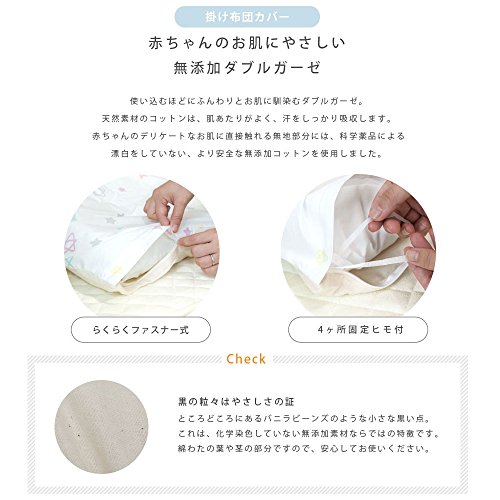 - 【掛け布団カバー】[サイズ]約90×120cm [品質]綿100% (無地部分:無添加ダブルガーゼ)[仕様]4ヶ所固定ヒモ付き ファスナー式 (長い辺に付いております) [重量]約170g