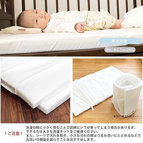 - 【敷き布団】[サイズ]約60×90×2.5cm(2枚入) [組成]側地:ポリエステル100% 詰め物:ポリエステル100% [重量]約1kg 【王冠まくら】[サイズ]約25×25cm [組成]側地:綿100%(無添加ダブルガーゼ)詰め物:ポリエステル100% [重量]約80g