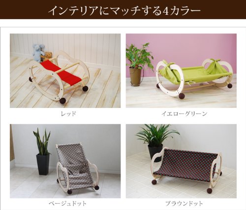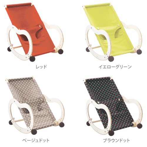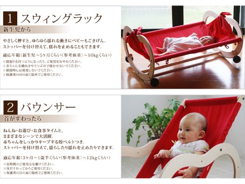 - 【適応年齢】スウィングラック:新生児~5ヶ月くらい(参考体重:~10kgくらい)、バウンサー:3ヶ月~1歳半くらい(参考体重:~12kgくらい)、ロッキングポニー:1歳半~3歳くらい(参考体重:~16kgくらい)、カウチ:2歳~5歳くらい(参考体重:~20kgくらい)