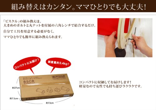 少し成長すると使えなくなるベビー用品。ベビーが大きくなってもずっと使えたらいいな・・・。そんな思いからBSCR(ビスクル)は生まれました。お子様の成長に合わせて組み替え、【BSCR】は共に成長します。 新生児から5ヶ月くらいまではスウィングラック、首が座ったらバウンサー、1歳半くらいになったらロッキングポニー。そして2歳頃からはカウチとしいて、お子様の成長に合わせて組み替えながら長くお使いいただけます。