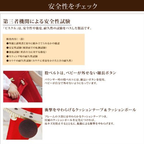 ■安心の日本製 BSCRは木と綿を使用し、ナチュラルなぬくもりを大切に仕上げました。本体の加工はすべて日本で行っているので安心です。使用している木材フレームはホルムアルデヒド放出量の極めて少ないエフ・フォースターの木材を使用しています。 ■公的な第三者機関で行われた安全性や強度、耐久性の試験をパスした商品です。 【検査内容(一部)】:安全性試験(傾斜面での転倒試験) 強度試験(垂直の力に対する試験) スウィング時の耐久試験 カウチの耐久性試験(カウチに重量をかけた時の耐久性)