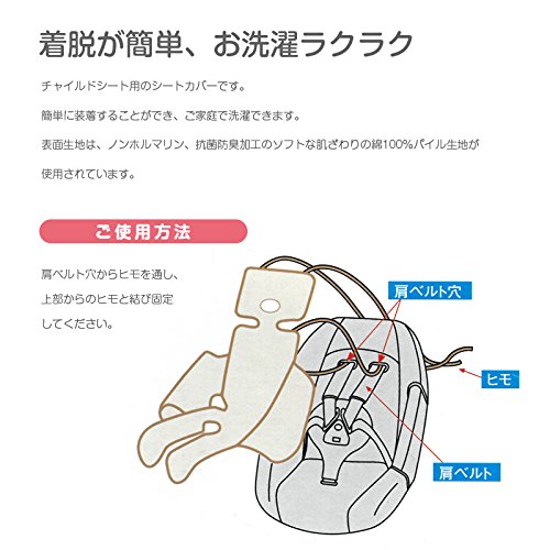- 着脱カンタン!お洗濯ラクラク!チャイルドシート用シートカバーです。 表面生地は、ノンホルマリン、抗菌防臭加工のソフトな肌触りの綿100%パイルタオル生地を使用しています。