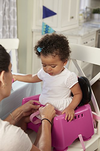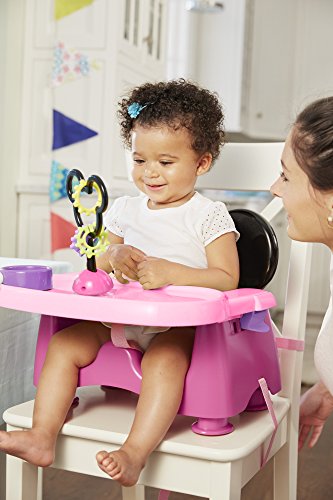 Get a helping hand at mealtime and toys help with motor skill development;Store bibs and wipes in back of seat;Adjustable height for the perfect fit with three-position, dishwasher-safe tray;Three-point harness; Chair straps attach to most adult chairs;Comes with 3 toys: roller ball, rattle head, and spring hand