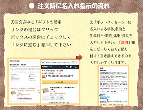 名入れはカートに入れた後、注文確定前に、「注文内容を確認・変更する」ページ内の 商品情報すぐ下の「ギフトの設定」をクリックし 「ギフトメッセージ」欄に 字体・名前・日付・時間・体重・身長をご記入ください