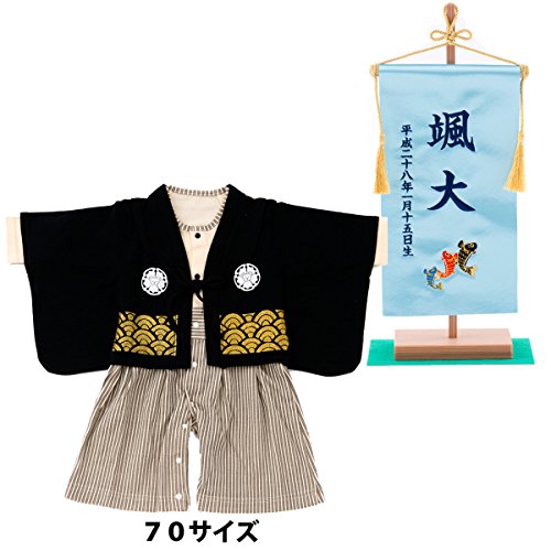 袴カバーオール ロンパース 名前旗 サックス ベビー キッズ 紋付 70サイズ