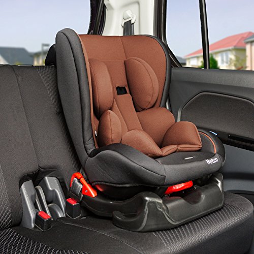 【新生児~4歳頃までのチャイルドシート 車内ゆったりコンパクトサイズ neb:o】(欧州安全基準 ECE-R44認定) ワイドな座面 ふかふかクッション 安心リクライニング機能 軽量5.3kg 洗濯機で洗えるカバー 体重:~18kg (ブラウン色)