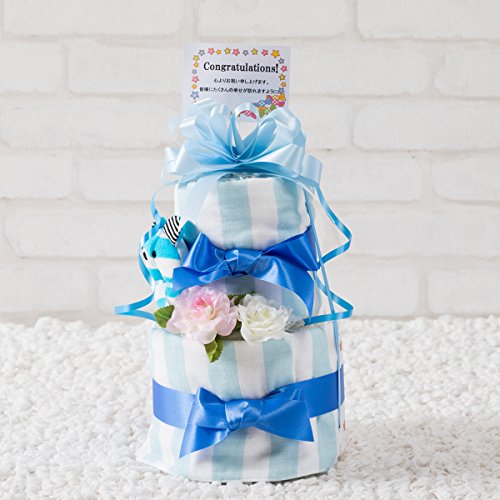 【おむつケーキ 今治タオル 男の子 女の子 出産祝い】 きっと喜ばれる今治タオル入! おむつケーキ 今治ウォッシュタオル ラッピング付き ご出産祝いに最適 おむつパンパース(Sサイズ-テープ) 柄:ストライプ 色:ブルー
