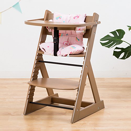 【ベビーチェア テーブル付き ハイチェア 高さ調節 木製 専用クッション付き】こどもと一緒に成長するチェア 高さ調節可能! 安全ベルト付き ふかふかクッションセット チェア色:スイーツ クッション色/柄:ブラウン