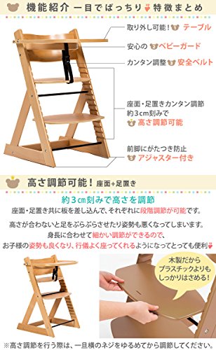 [Point-1] 高さ調整 :ダイニングの高さとお子様の成長に合わせて調節できるから、お子様と近い目線で向き合ってお食事ができます。座面・足置き共に3cm刻みでの調節が可能。成長と共に長く付き合えるチェアです。