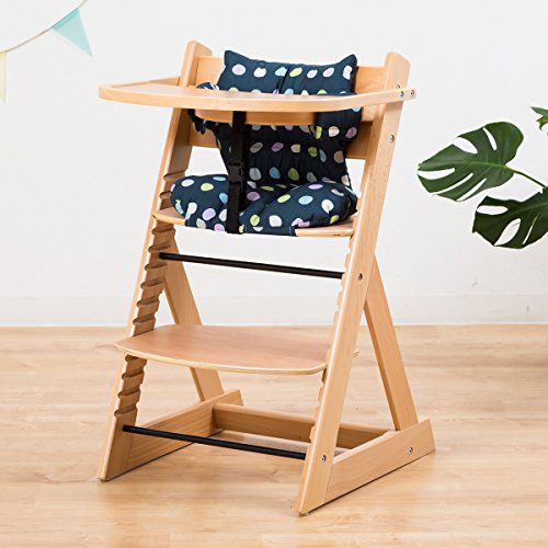 【ベビーチェア テーブル付き ハイチェア 高さ調節 木製 専用クッション付き】こどもと一緒に成長するチェア 高さ調節可能! 安全ベルト付き ふかふかクッションセット チェア色:大水玉ネイビー クッション色/柄:ナチュラル