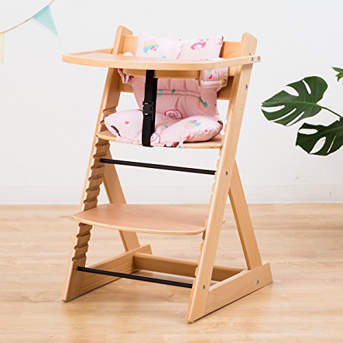 【ベビーチェア テーブル付き ハイチェア 高さ調節 木製 専用クッション付き】こどもと一緒に成長するチェア 高さ調節可能! 安全ベルト付き ふかふかクッションセット チェア色:スイーツ クッション色/柄:ナチュラル