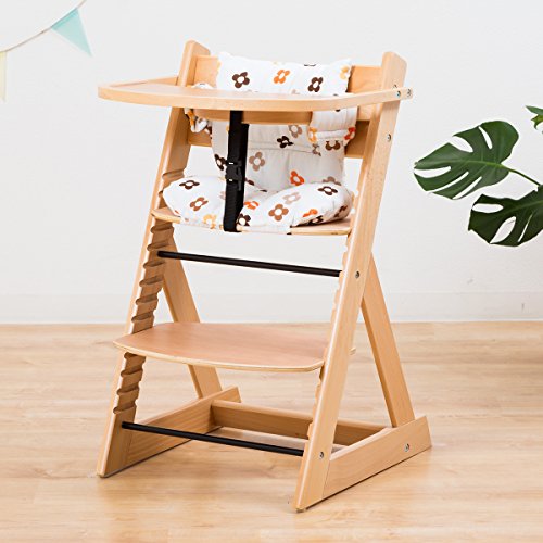 【ベビーチェア テーブル付き ハイチェア 高さ調節 木製 専用クッション付き】こどもと一緒に成長するチェア 高さ調節可能! 安全ベルト付き ふかふかクッションセット チェア色:花柄ブラウン クッション色/柄:ナチュラル