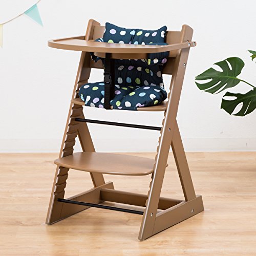 【ベビーチェア テーブル付き ハイチェア 高さ調節 木製 専用クッション付き】こどもと一緒に成長するチェア 高さ調節可能! 安全ベルト付き ふかふかクッションセット チェア色:大水玉ネイビー クッション色/柄:ブラウン