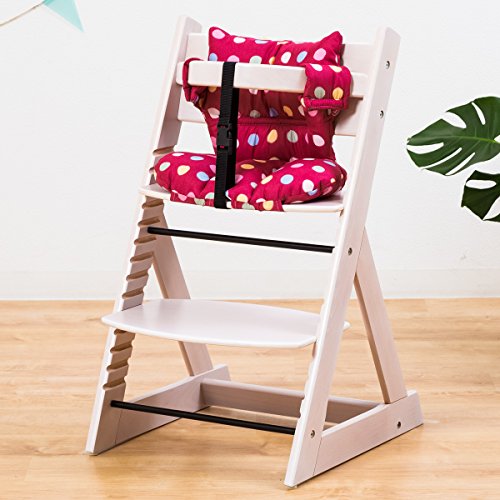 【人気ベビーチェア 笑顔のマジカルチェアー+専用クッション (お得2点セット)】 木製椅子 安心強度の三角形ベース 高さ調節可能 ふかふかクッションセット (チェア:ホワイトウォッシュ色 クッション:大水玉レッド)