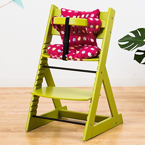 【人気ベビーチェア 笑顔のマジカルチェアー+専用クッション (お得2点セット)】 木製椅子 安心強度の三角形ベース 高さ調節可能 ふかふかクッションセット (チェア:グリーン色 クッション:大水玉レッド)
