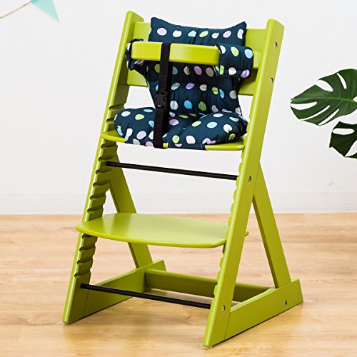 【ベビーチェア ハイチェア 高さ調節 木製 専用クッション付き】こどもと一緒に成長するチェア 高さ調節可能! 安全ベルト付き ふかふかクッションセット チェア色:ライム クッション色/柄:大水玉ネイビー