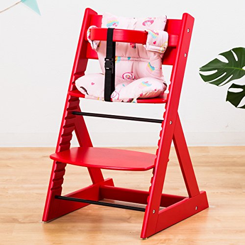 【ベビーチェア ハイチェア 高さ調節 木製 専用クッション付き】こどもと一緒に成長するチェア 高さ調節可能! 安全ベルト付き ふかふかクッションセット チェア色:レッド クッション色/柄:スイーツ