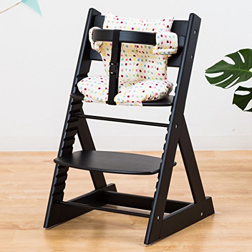 【ベビーチェア ハイチェア 高さ調節 木製 専用クッション付き】こどもと一緒に成長するチェア 高さ調節可能! 安全ベルト付き ふかふかクッションセット チェア色:ブラック クッション色/柄:小水玉レッド