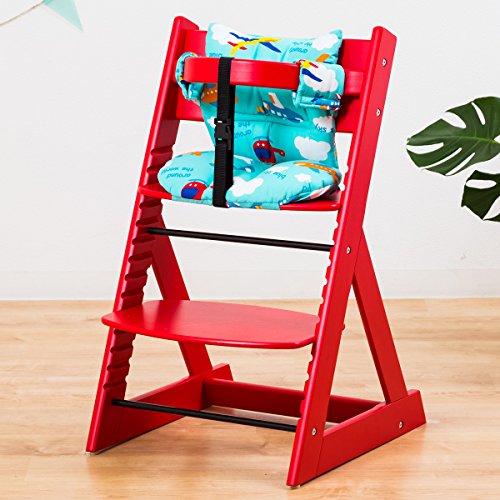 【ベビーチェア ハイチェア 高さ調節 木製 専用クッション付き】こどもと一緒に成長するチェア 高さ調節可能! 安全ベルト付き ふかふかクッションセット チェア色:レッド クッション色/柄:飛行機
