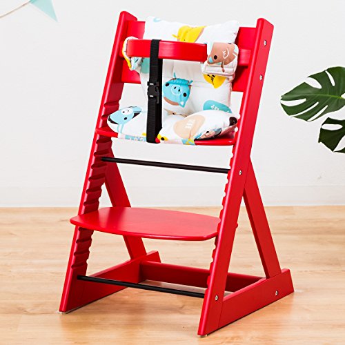 【人気ベビーチェア 笑顔のマジカルチェアー+専用クッション (お得2点セット)】 木製椅子 安心強度の三角形ベース 高さ調節可能 ふかふかクッションセット (チェア:レッド色 クッション:アニマルブルー)